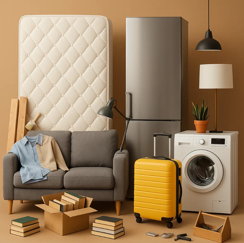 • Furniture and electrical appliances (mattresses, sofas, refrigerators, washing machines, etc.) • Personal belongings, luggage, books, and clothing • Decoration materials, lamps, and small tools |